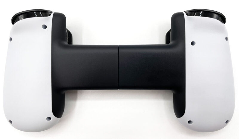 まずは、正面から見てみよう。「PlayStationエディション」というだけあって、ボタン形状やスティク、配色などがPS5コントローラーを意識したデザインになっている。全体の質感はマットで落ち着いた印象。サイズ感はコンパクトにまとまっており、携帯性にも優れている。